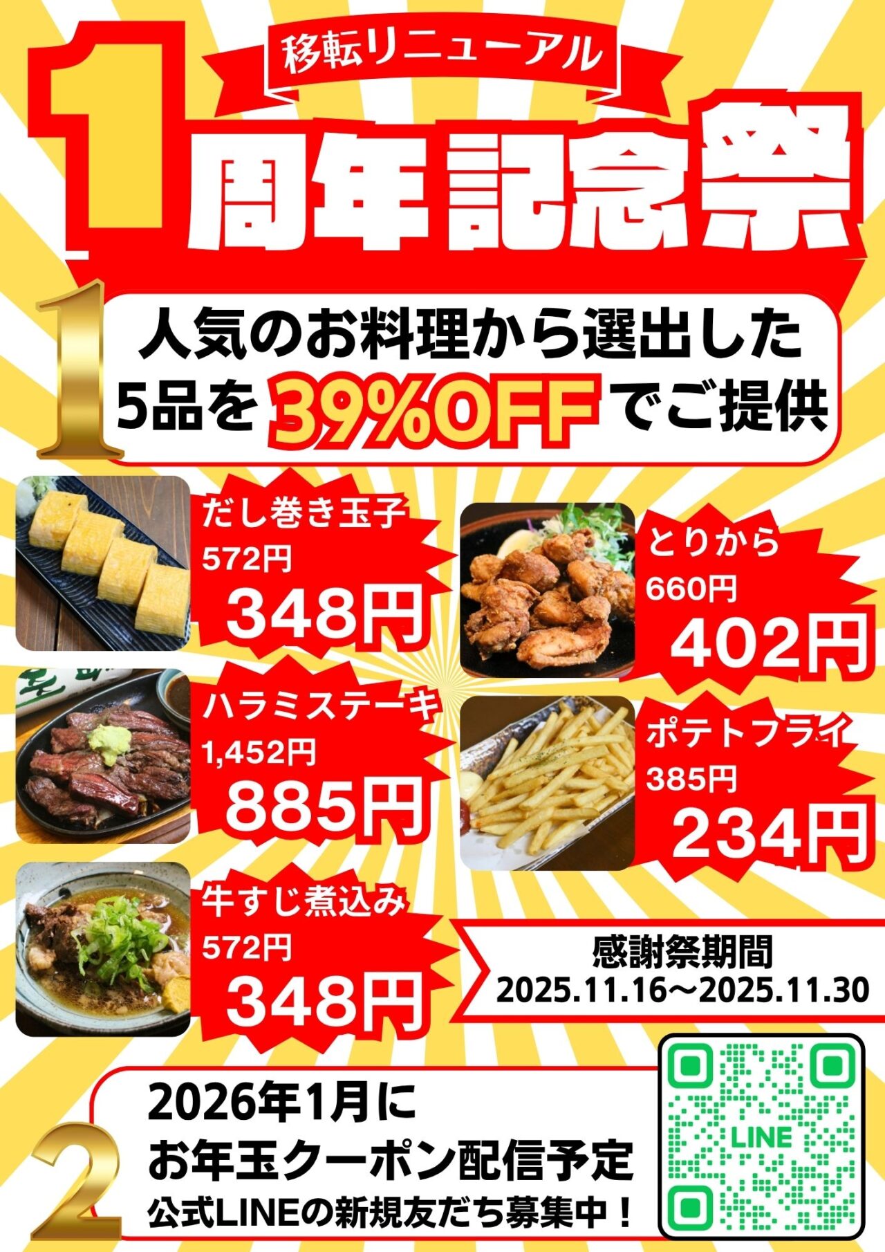 【加古川市】串焼だいにんぐ 良々で「移転リニューアル1周年記念 感謝祭」が開催されます。