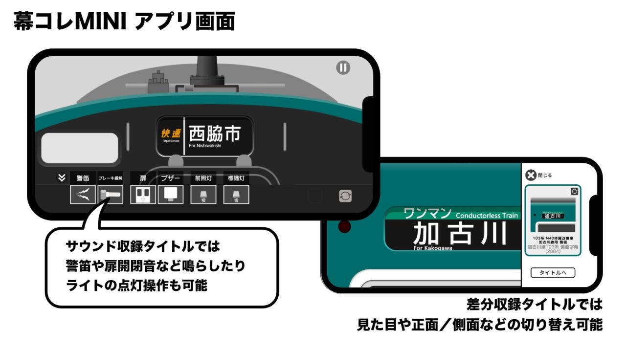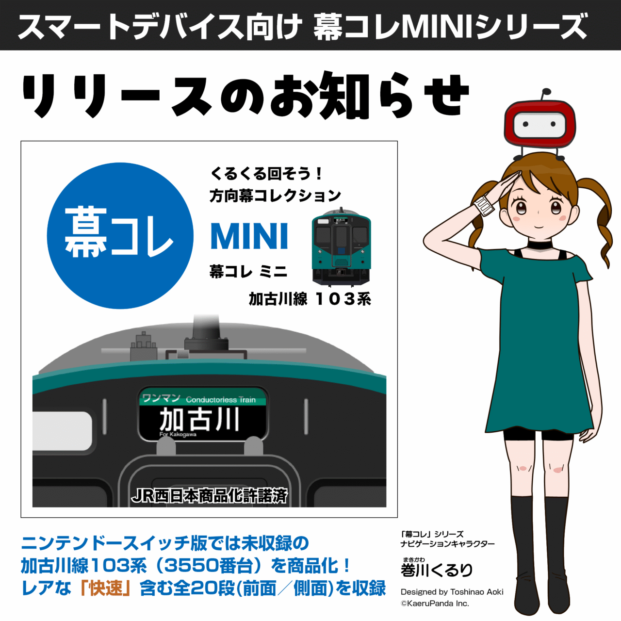 カエルパンダは、Nintendo Switchで発売中の『くるくる回そう!方向幕コレクション』のスマートフォン向けスピンオフ『幕コレMINI』シリーズで「加古川線 103系」を発売しました。