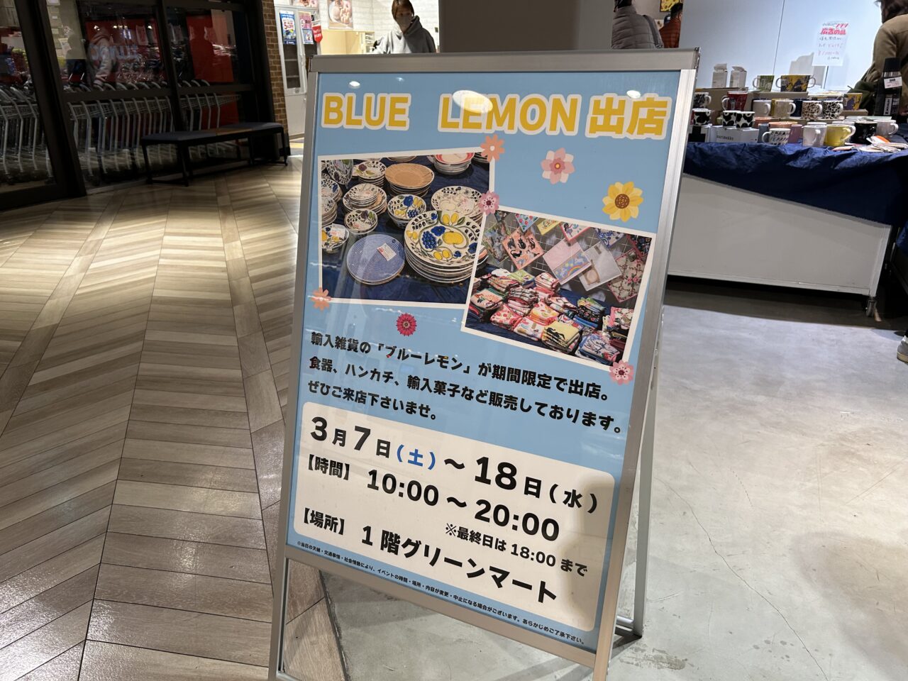 輸入雑貨の「ブルーレモン」が期間限定で出店。食器、ハンカチ、輸入菓子などが販売されています。