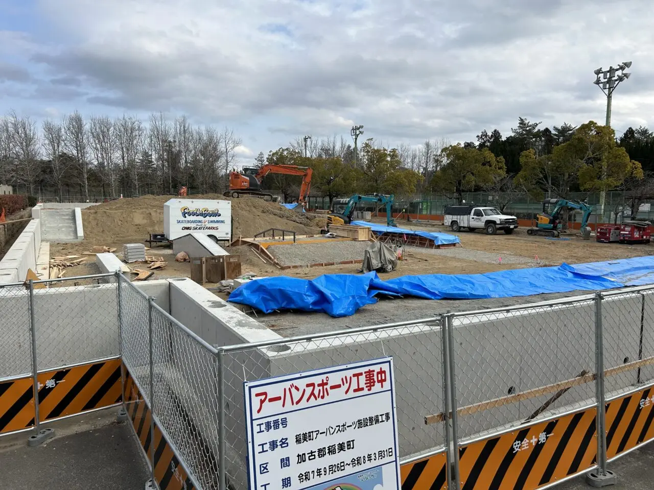 稲美町アーバンスポーツ施設設備の工事中です。2025年9月から工事が始まっており、予定工事期間は2026年3月まで!