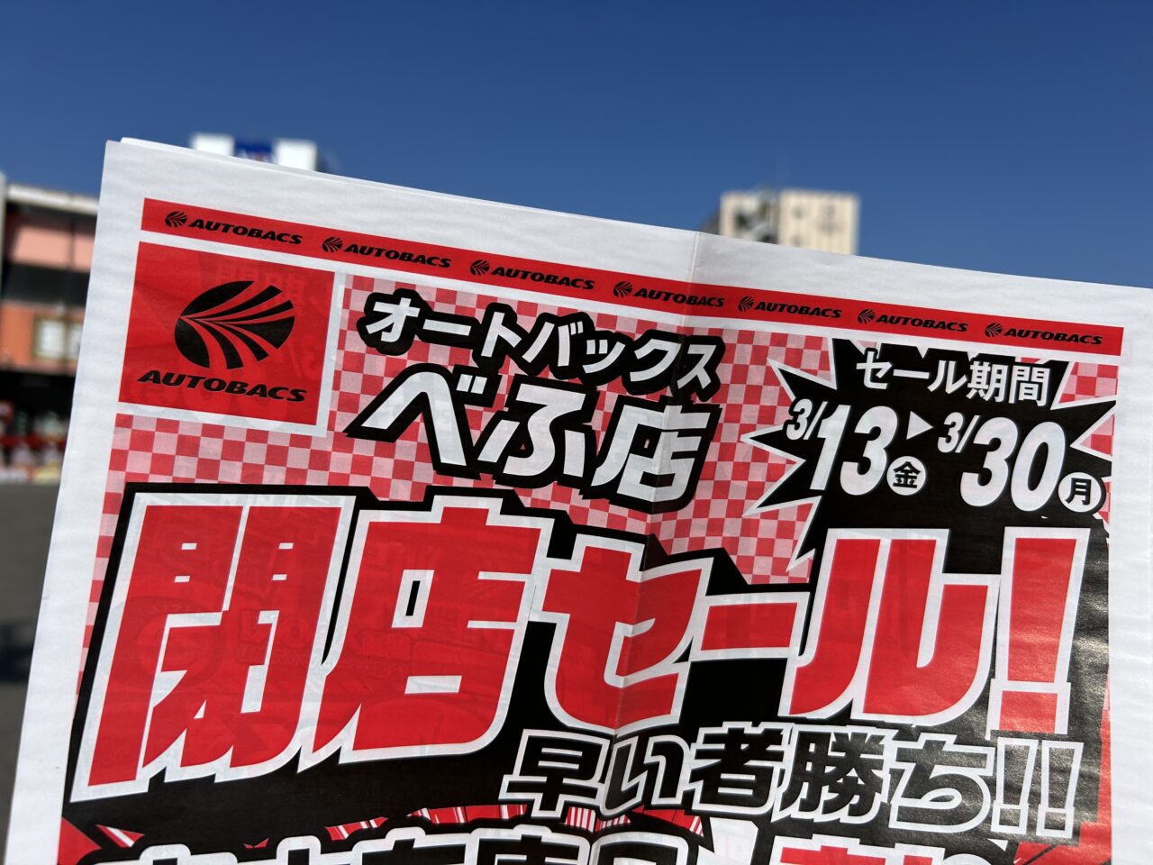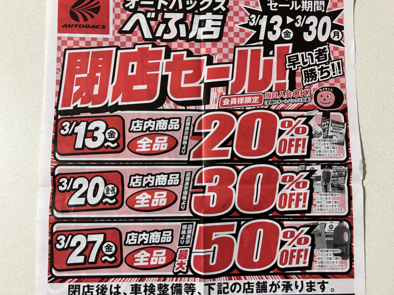 【加古川市】別府町にあるオートバックスが3月末日をもって閉店。売り尽くし閉店セールが始まっています。