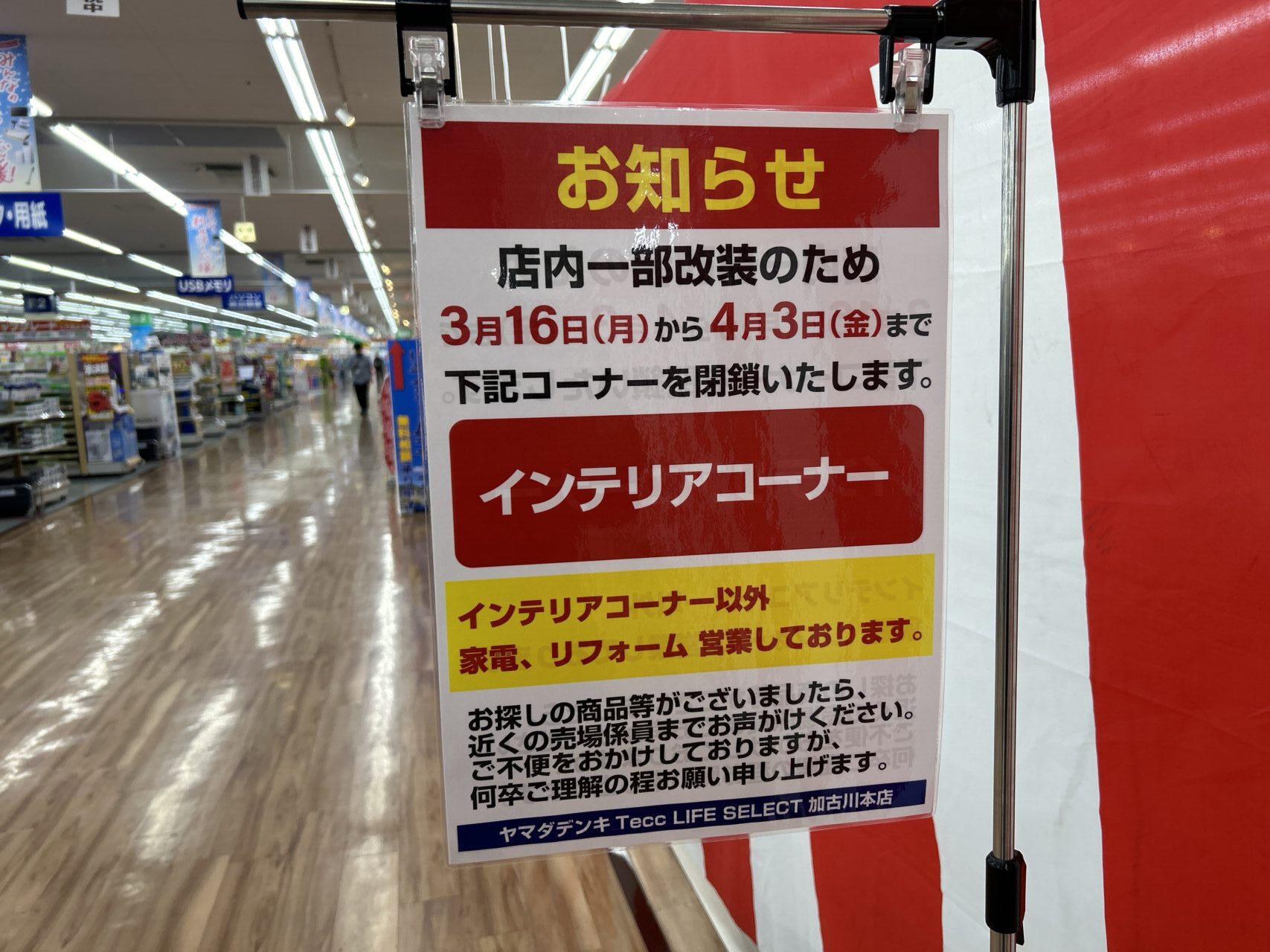 【加古川市】ヤマダデンキ Tecc LIFE SELECTの店内一部改装中。インテリアコーナーが閉鎖しています。
