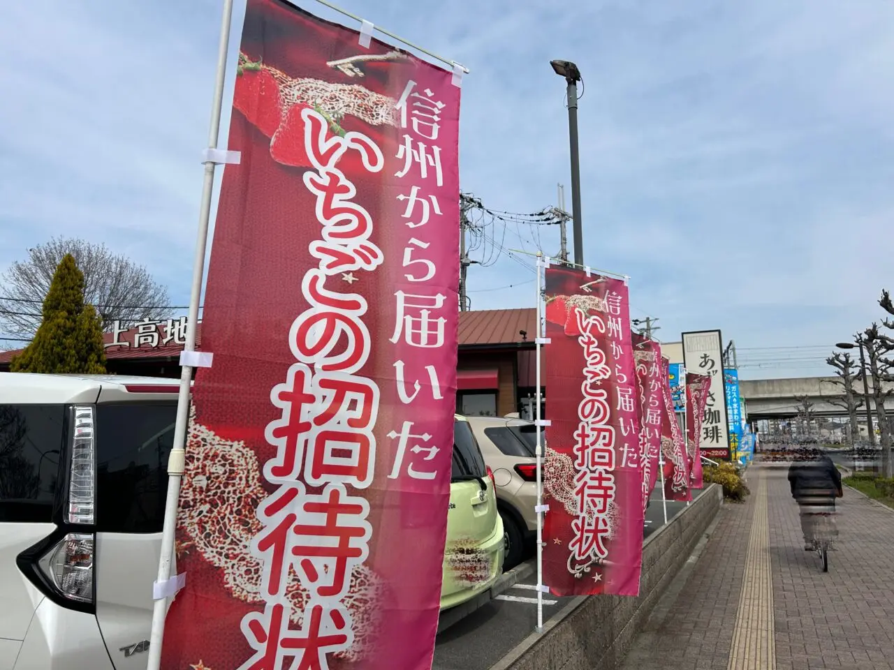 ニッケパークタウンのある周辺を歩いていると、このように書かれた旗が道路沿いに並んでました。信州産いちごを使ったデザートが始まっています!2026年3月4日(水)にスタート。担当の方によると、5月下旬頃まで予定しているようです。