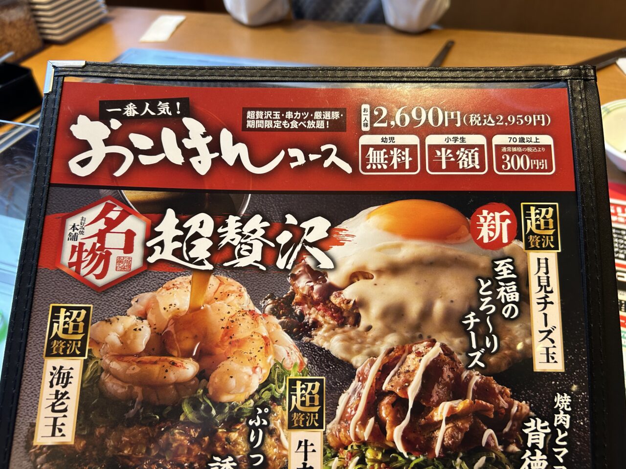 初めてのお店ということもあり、今回は一番人気の「おこほんコース」を注文してみました!料金はなんと幼児無料、小学生半額、70歳以上は通常価格の税込より300円引きです。