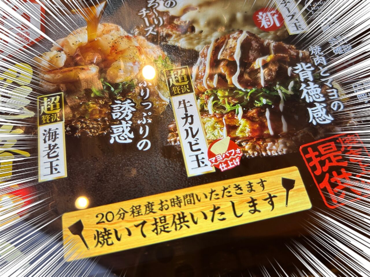 「マヨパフォ仕上げ」。メニューの横にこのように書かれてある商品を注文すると、ビヨーーーーーンと頭上よりも高く、ド迫力のスタイルでマヨネーズをかけてもらえるのです。さらに見つけたのは、