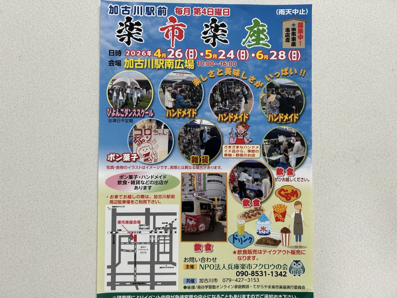 【加古川市】毎月第4日曜日はJR加古川駅前で「楽市楽座」。今月は4月26日(日)開催です。